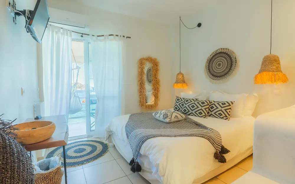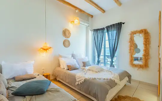 Our quadruple accommodation in Tolo is located right on the beach and offers instant beach access as well as some incredible views. Decorated in a modern-bohemian style that gives it a grounded and relaxing atmosphere while at the some time nodding to the villages history and tradition.